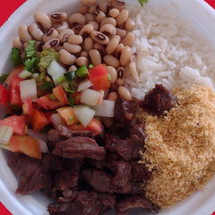 Feijão macassa, arroz, charque, farofa e vinagrete.