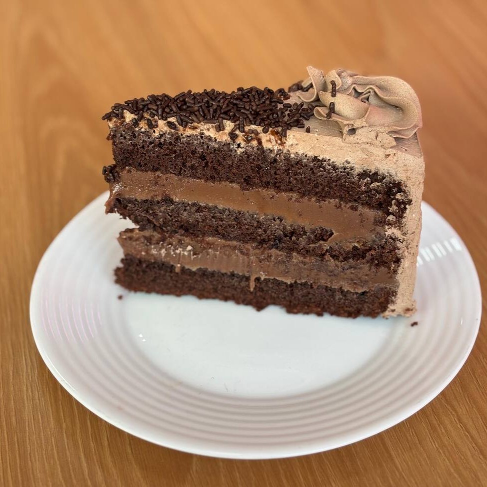 Fatia de torta com massa de chocolate e recheio de brigadeiro de coco