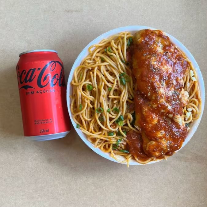 Espaguete & Parmegiana Frango + Coca Zero Pet + R$ 18,99 Leve Outra Marmitex