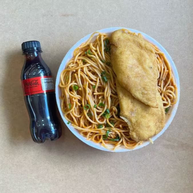 Marmita com delicioso filé de frango empanado na massa crocante acompanhado de macarrão espaguete ao molho de tomates. Acompanha refrigerante lata Coca Cola 350ml bem gelada. Marmita indicada para 01 pessoa.