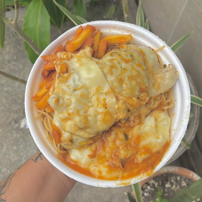 Delicie-se com nosso 'Peito de Frango Empanado', uma maravilhosa opção de almoço que traz uma combinação harmoniosa de arroz soltinho, macarrão e feijão a sua escolha cuidadosamente selecionado, temperado ao seu gosto. O protagonista, nosso peito de frango, é empanado à perfeição, garantindo uma casquinha crocante por fora e um interior suculento. Para completar, uma farofa crocante dá o toque final de textura, enquanto o vinagrete fresco adiciona um toque de acidez ao prato. Para finalizar, um purê macio e aveludado equilibra esta farta refeição. Uma autêntica explosão de sabores nordestinos!