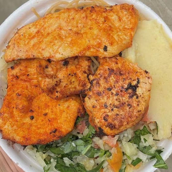 Peito de frango grelhado, temperado com ervas finas, servido com purê de batata , arroz e legumes salteados. Uma refeição leve e saborosa para quem busca saúde!