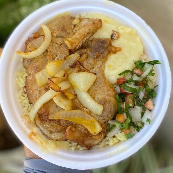 Nossa 'Bisteca de Porco' é uma combinação primorosa, ideal para um almoço requintado. Começa com o arroz soltinho, delicadamente cozido, juntamente com um macarrão irresistível. Um feijão à sua escolha, perfeitamente temperado, acrescenta um toque caseiro ao prato. A estrela, a Bisteca de Porco, é suculenta e saborosa, rigorosamente selecionada e preparada. Para completar, uma farofa crocante dá o contraste perfeito de texturas, enquanto o vinagrete fresco acrescenta um toque de leveza. E, por fim, um purê cremoso e aveludado que faz desta refeição uma verdadeira explosão de sabores!