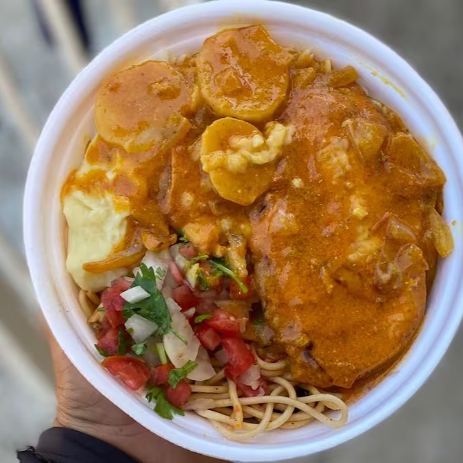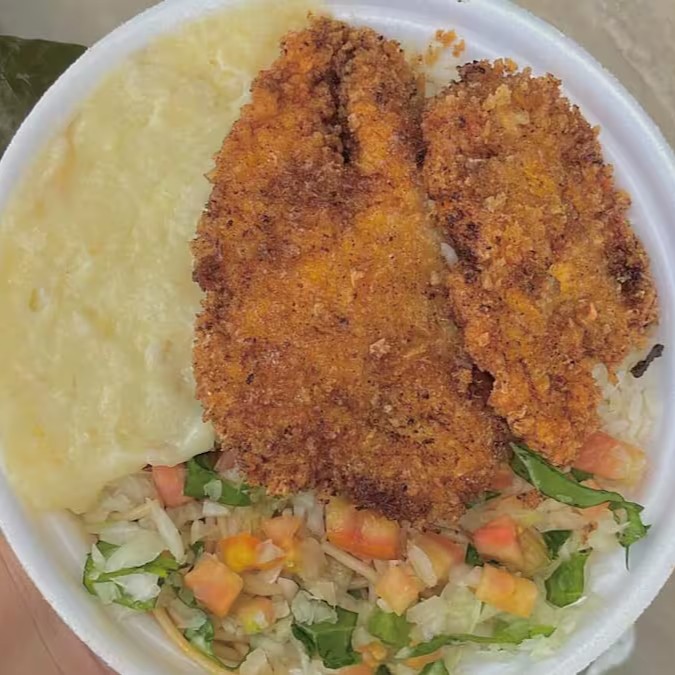 Delicie-se com nosso 'Peito de Frango Empanado', uma maravilhosa opção de almoço que traz uma combinação harmoniosa de arroz soltinho, macarrão e feijão a sua escolha cuidadosamente selecionado, temperado ao seu gosto. O protagonista, nosso peito de frango, é empanado à perfeição, garantindo uma casquinha crocante por fora e um interior suculento. Para completar, uma farofa crocante dá o toque final de textura, enquanto o vinagrete fresco adiciona um toque de acidez ao prato. Para finalizar, um purê macio e aveludado equilibra esta farta refeição. Uma autêntica explosão de sabores nordestinos!
