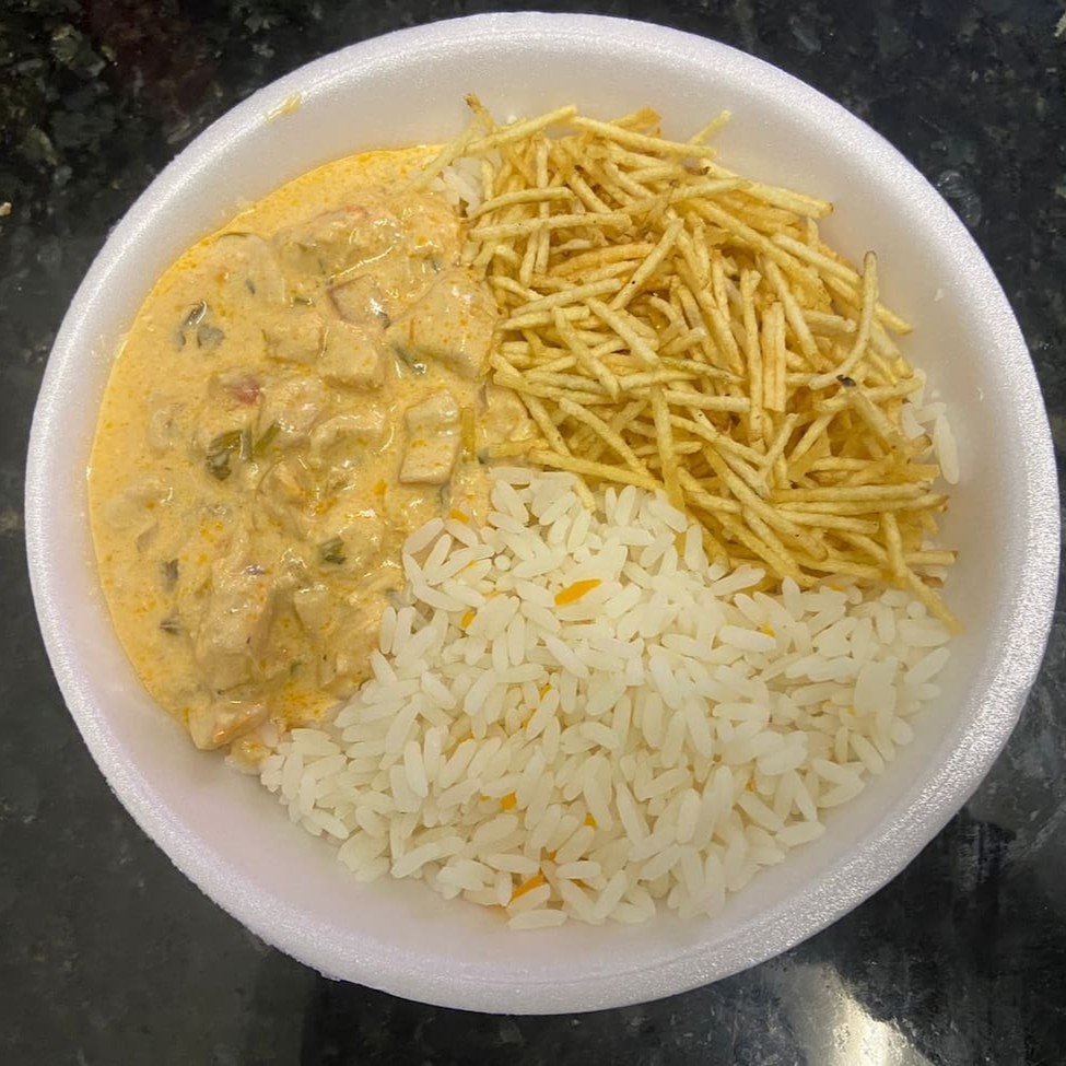Marmita bem servida acompanhada de arroz branco e batata palha.