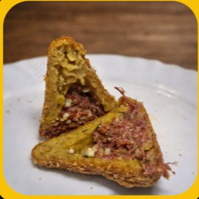 Coxinha de charque desfiado e bem temperado, com queijo coalho, envolvida em massa macia de batata e finalizada com uma camada crocante de farinha panko.