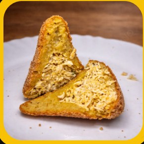 Coxinha de frango feita com massa leve de batata, recheada com frango desfiado e bem temperado, combinada com Catupiry de alta qualidade, cremoso na medida certa. Finalizada com uma camada super crocante de farinha panko.