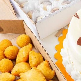 Mine torta de aproximadamente 0,500g sabor bem casado, 20 salgados sortidos e 14 doces finos sortidos