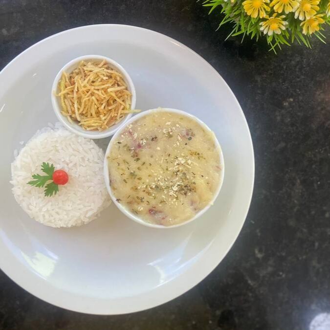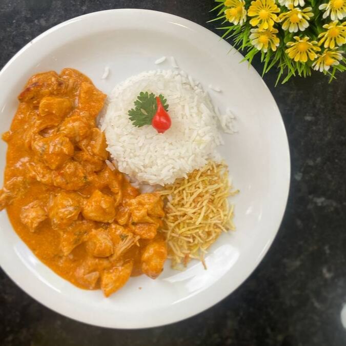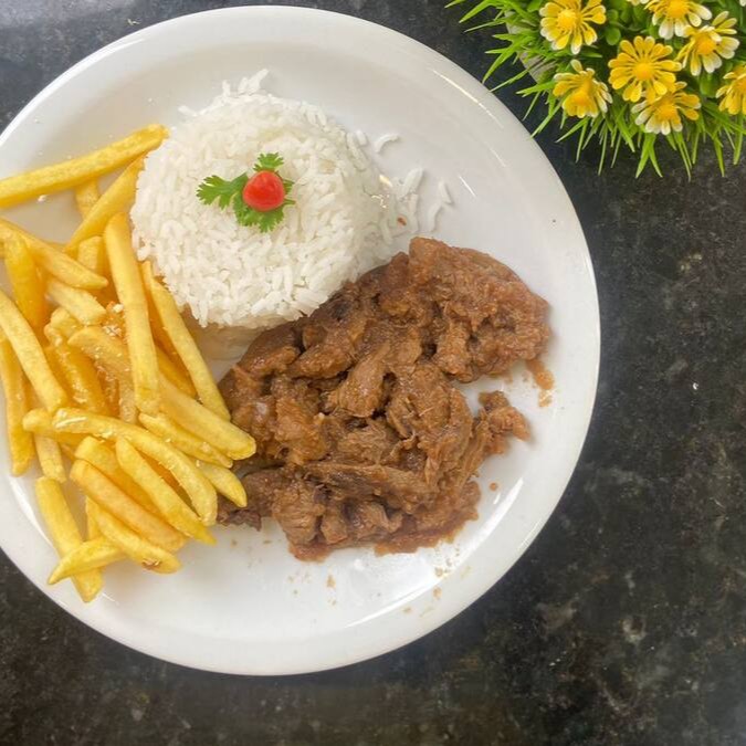 Acompanha arroz branco e batata palha.