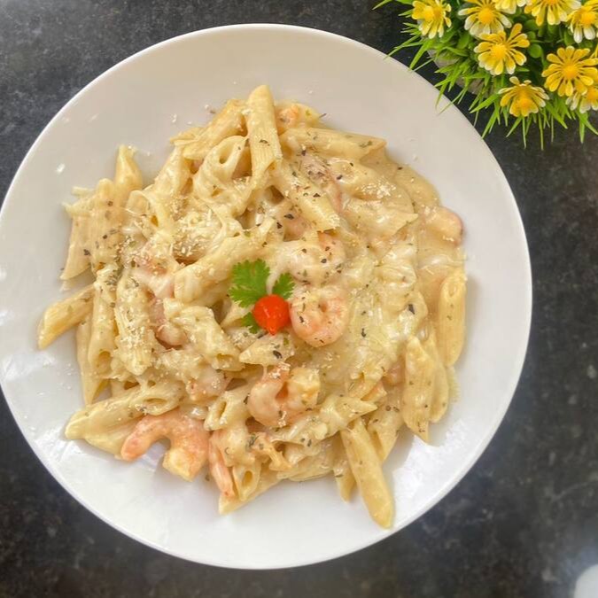 Macarrão penne com camarão ao molho de quatro queijos.