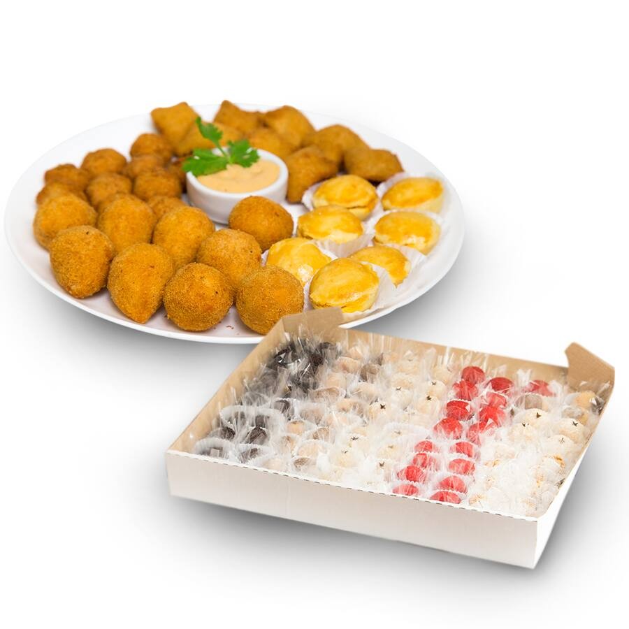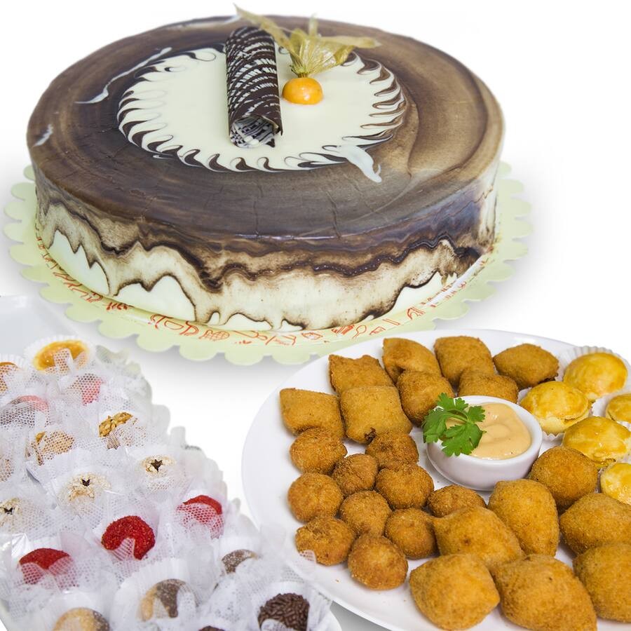 Mini torta 0,500 kg , 20 salgados tradicionais sortidos e 14 doces finos sortidos.