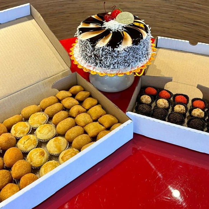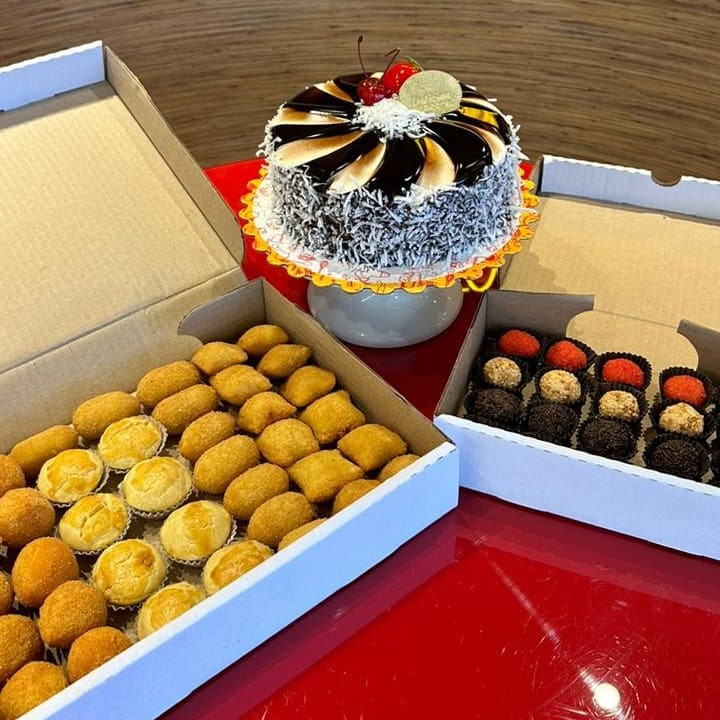 Composto: 1 torta G de 2kg opção do sabor: bem casado, brigadeiro ou chocolate + 100 doces ( 20 brigadeiros, 20 bem casados, 20 beijinhos, 20 moranguinhos, 20 ouriços. ) + 120 salgados ( 40 coxinhas, 20 risoles de queijo, 20 bolinhos chester, 20 bolinhos de bacalhau, 20 bolivianos.).