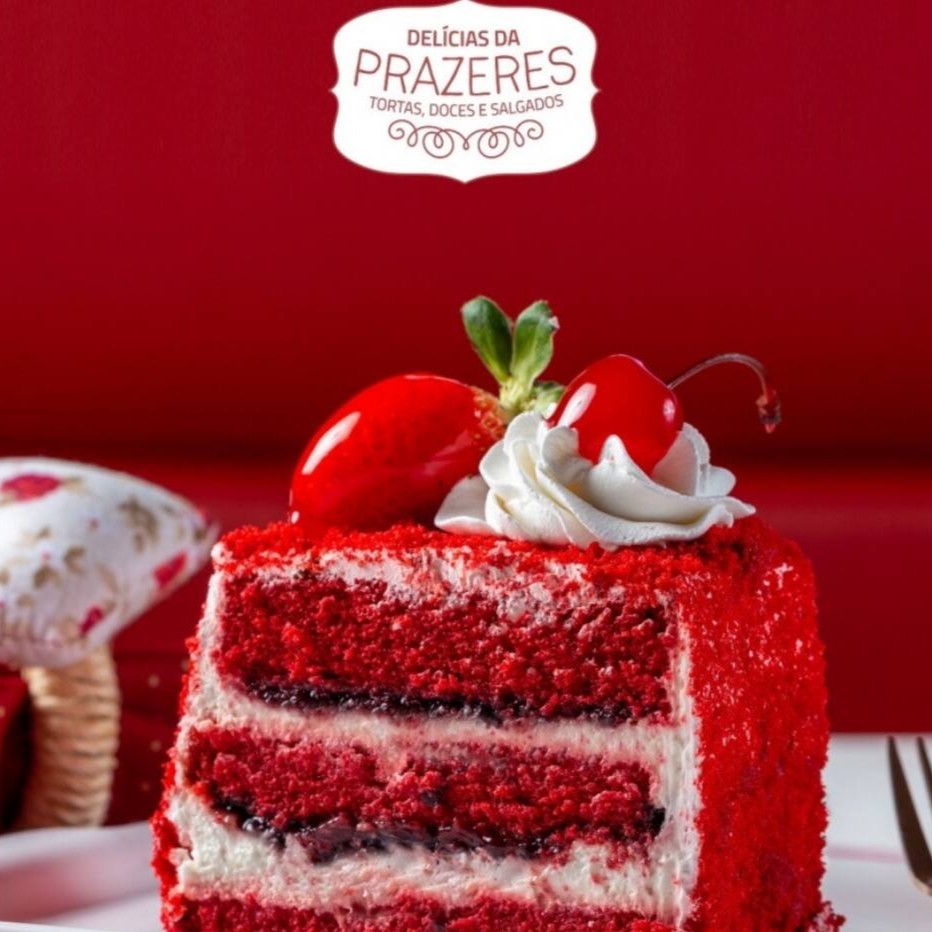 Fatia de Torta Red Velvet, com Recheio de Cream Cheese e Geleia de Frutas Vermelhas.