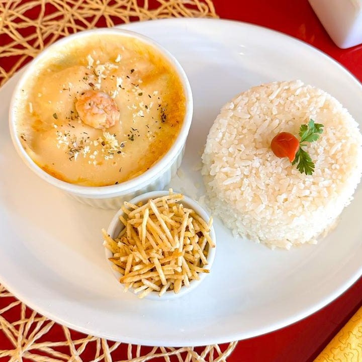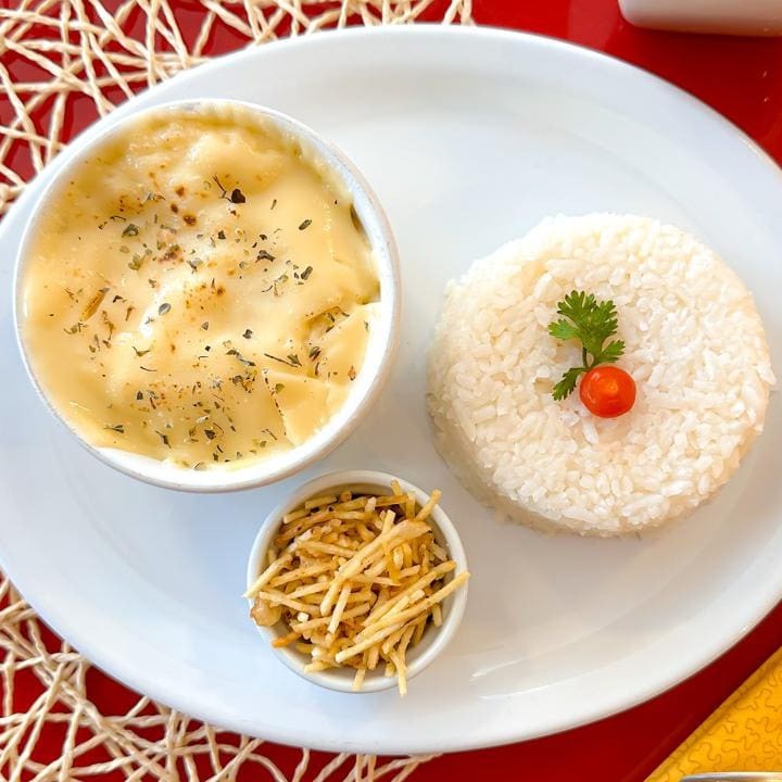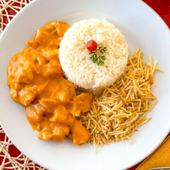 Frango em cubos ao molho branco e creme de leite, arroz branco e batata palha.