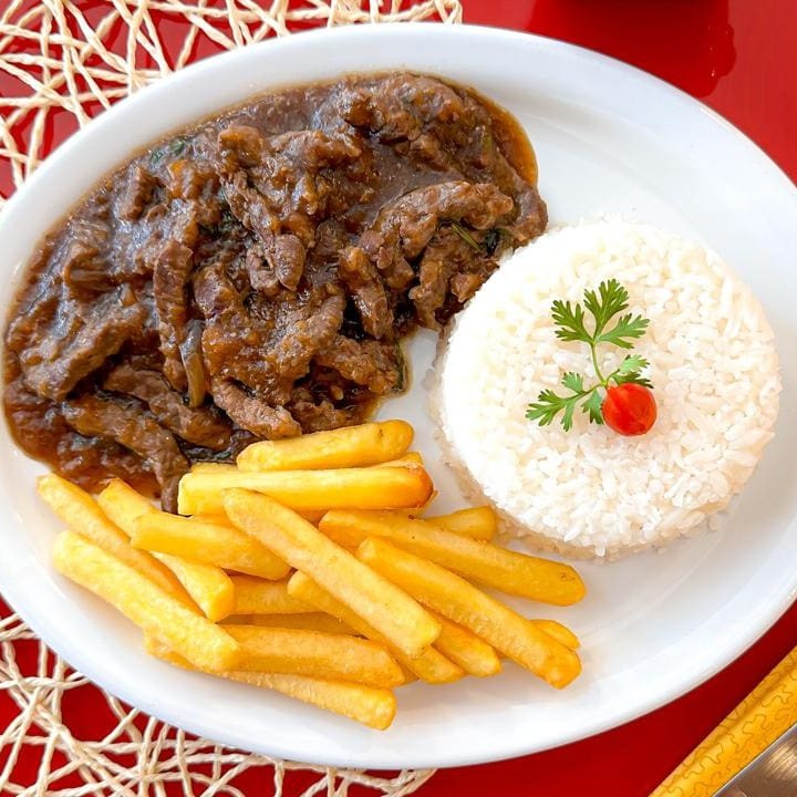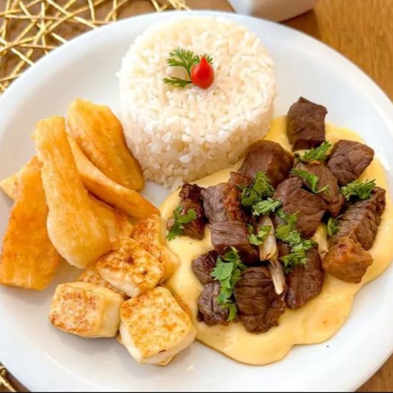 Carne de Sol com Creme de Queijo, macaxeira frita e Arroz.