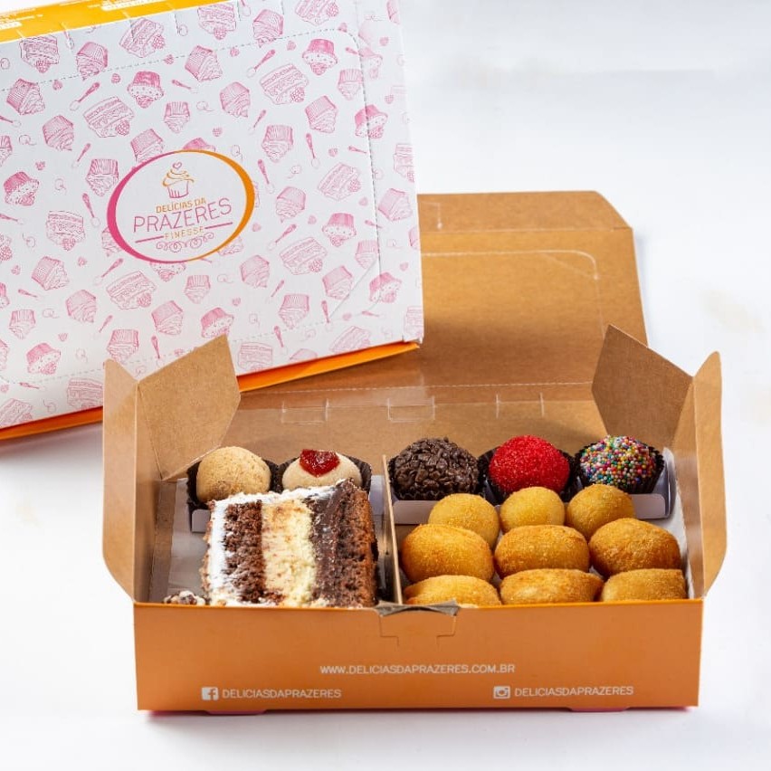 Composto: Mini torta chocolate ou bem casado + 5 brigadeiros, 5 bem casados + 10 coxinhas, 10 risoles de queijo.
