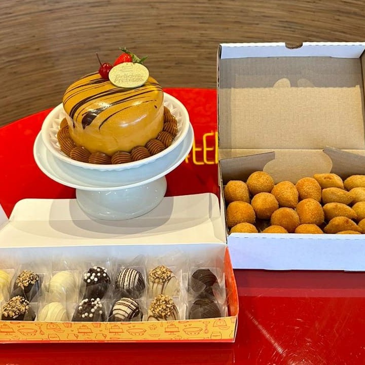 Mini torta, 1 embalagem com 14 doces finos (sortidos), 20 salgados (10 coxinhas, 5 risoles de queijo, 5 bolinhos chester); Obs: Detalhe do ganache preto pode variar. E poderá ter morango, cereja ou physalis na decoração.