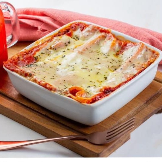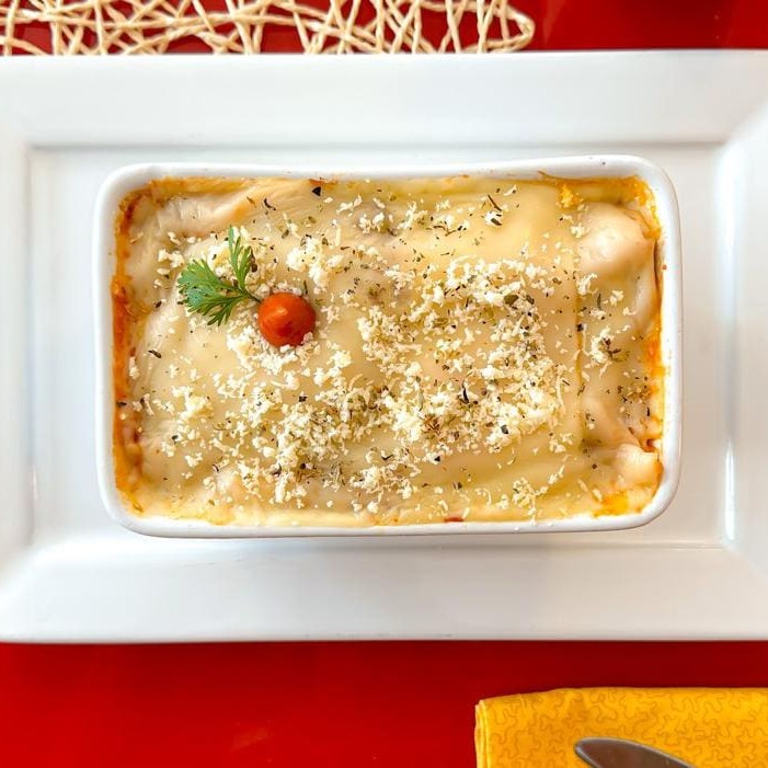 Massa de lasanha, bolonhesa, presunto, queijo mussarela e Molho branco.