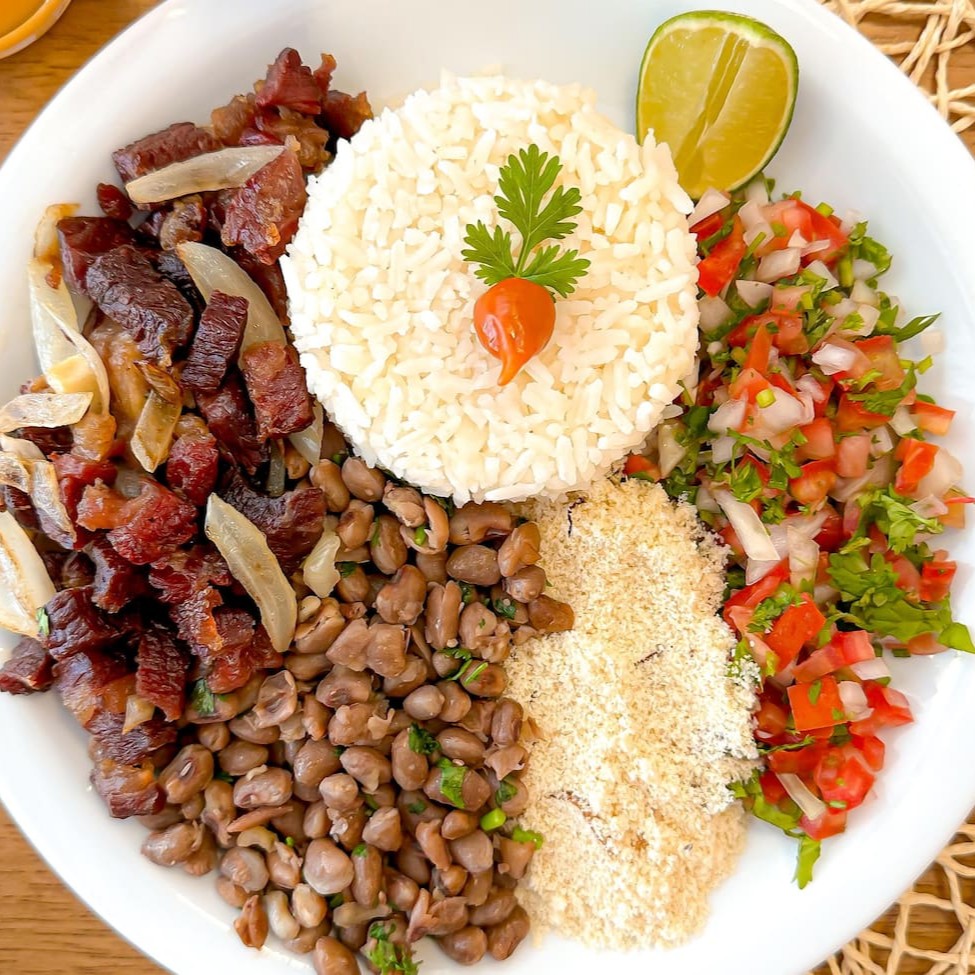 Acompanha carne de charque, arroz, feijão macassar, vinagrete e farofa.
