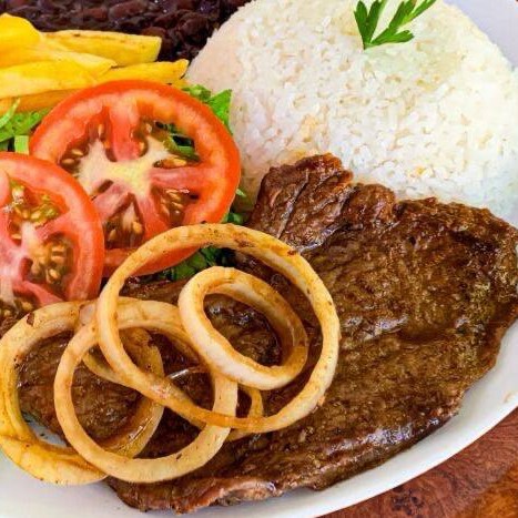 Suculento Bife Grelhado no ponto, com generosa camadas de cebolas na manteiga uma combinação clássica saborosa e caseira. Acompanha: Arroz soltinho, feijão preto, macarrão, salada e farofa crocante.