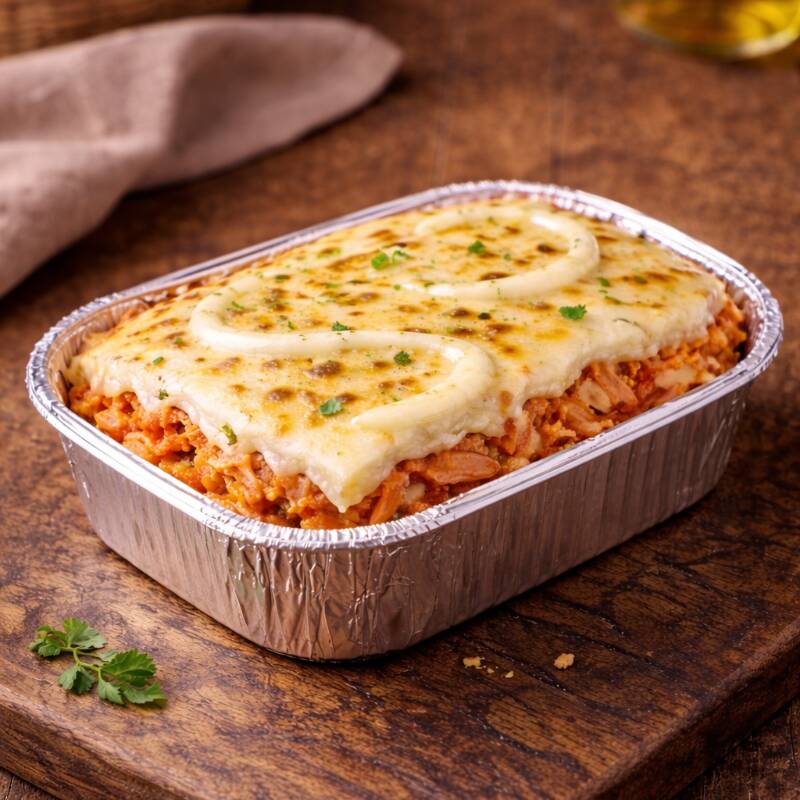 Mini Lasanha Bolonhesa com Catupiry, vai em uma embalagem de 220ml