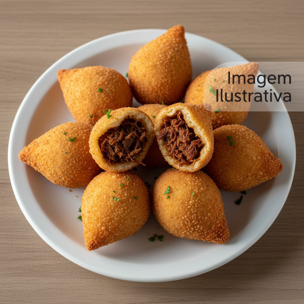 Coxinha recheada com carne seca desfiada e temperada, perfeita para os amantes de sabores fortes.