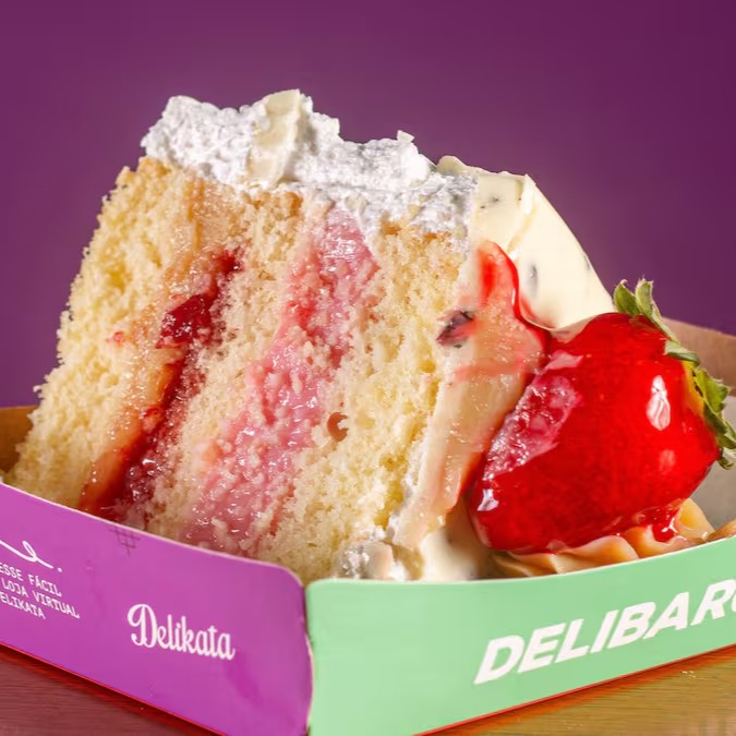 Fatia de bolo de leite com recheio de brigadeiro branco e geleia de frutas vermelhas mais creme de morango Nestlé, mais cobertura de chantilly premium, ganache de chocolate branco e cookies de Nesgresco. Peso: entre 190 e 210g