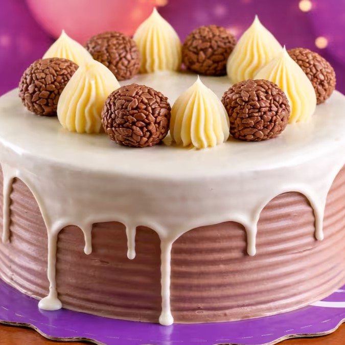 Bolo de chocolate com recheio de brigadeiro branco e ao leite, cobertura de ganache de chocolate branco e bicos de brigadeiro.