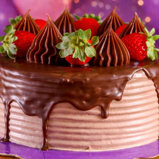 Bolo de chocolate com recheio de creme de morango Nestlé com brigadeiro, cobertura de chantilly de chocolate com ganache de chocolate meio amargo e morangos frescos.