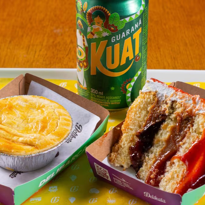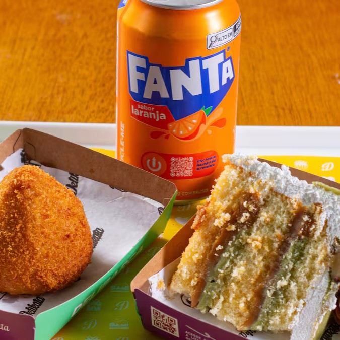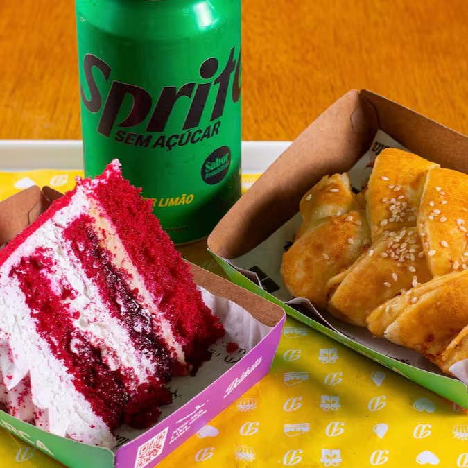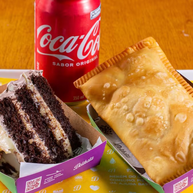 Seu lanche 1 fatia de bolo (190g), 1 pastel de feira e 1 refrigerante lata. Tudo a sua escolha.