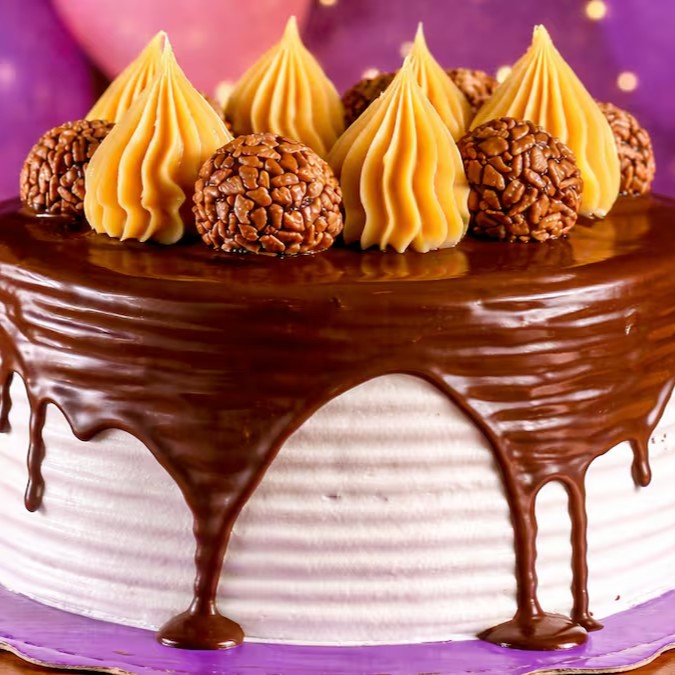 Bolo de chocolate com recheio de creme Ninho da Nestlé, creme Bueno de avelã, cobertura de chantilly premium de chocolate e ganache de chocolate branco. (Sabor inspirado no Kinder Bueno)
