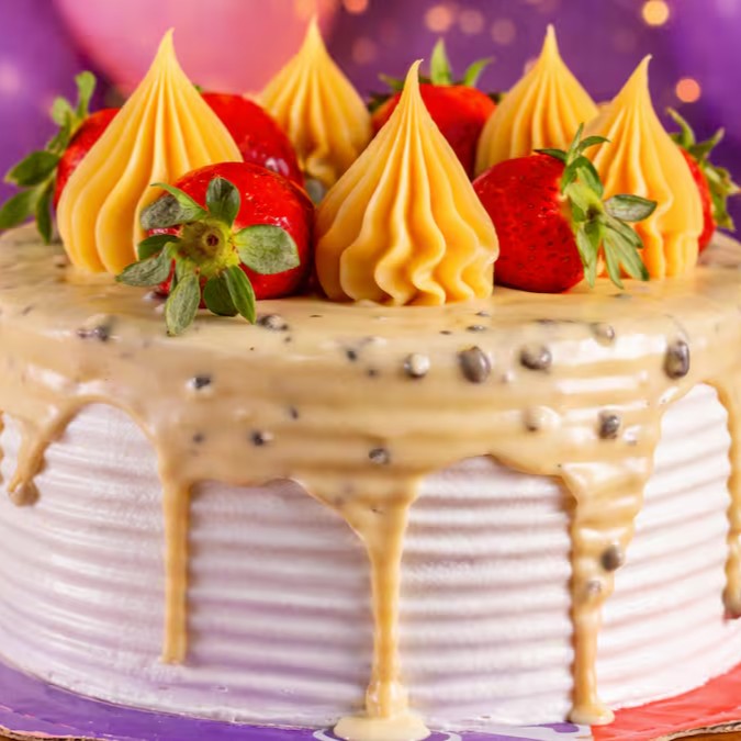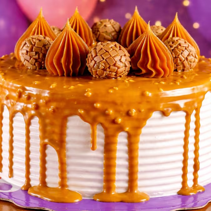 Bolo branco com recheio de doce de leite e caramelo salgado, com cobertura de ganache toffee.