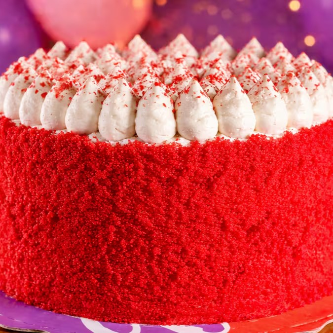 Bolo veludo vermelho com frosting de cream cheese, brigadeiro branco e geleia de morango.