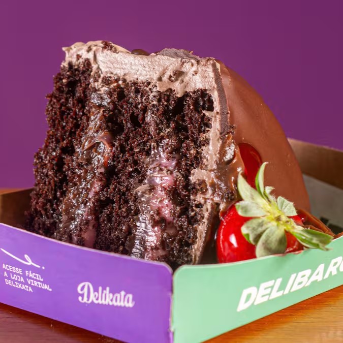 Fatia de bolo de chocolate com recheio de brigadeiro e creme de morango Nestlé. Cobertura de chantilly de chocolate premium e ganache de chocolate meio amargo com morangos frescos.