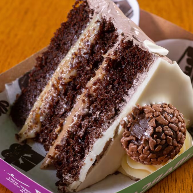 Fatia de bolo de chocolate com recheio de brigadeiro branco e ao leite, cobertura de chantilly de baunilha e ganache de chocolate branco. Peso: entre 190 e 210g