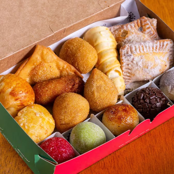 Escolha entre os sabores: carne e queijo, frango, queijo e pastel festa.