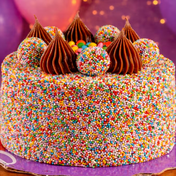 Brownie de chocolate com cobertura de brigadeiro e confetes coloridos.