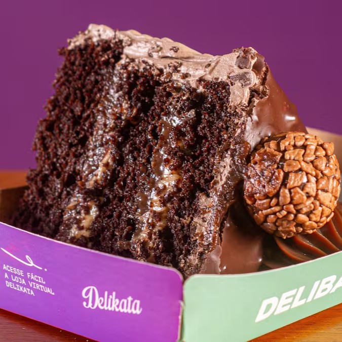 Bolo de chocolate com recheio de brigadeiro e creme de chocolate meo amargo, com cobertura de granulado de chocolate nobre 70% cacau.