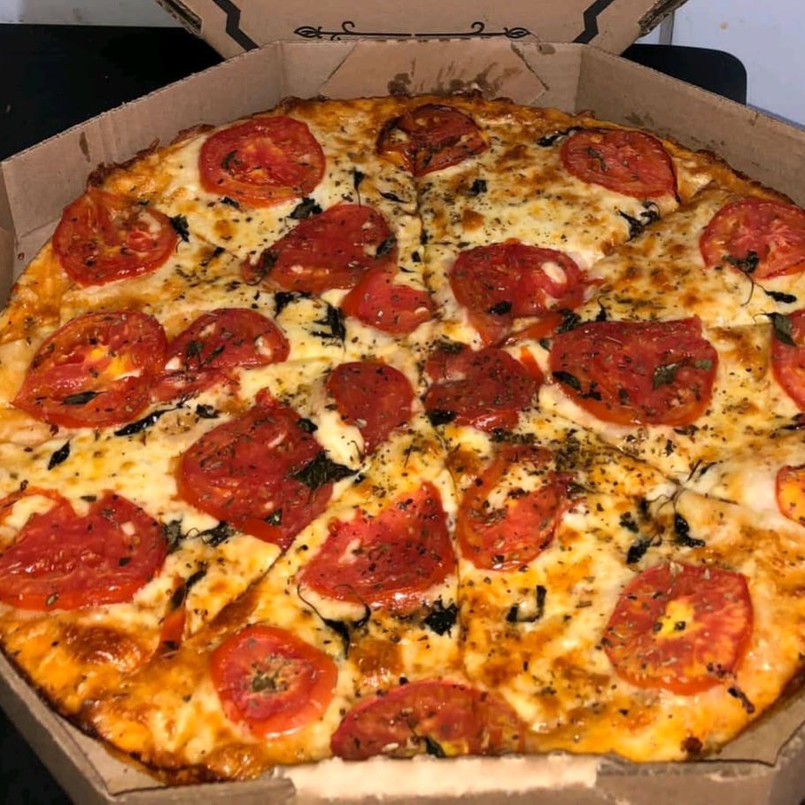 Massa da casa, queijo mussarela, manjericão, tomate e oregano.