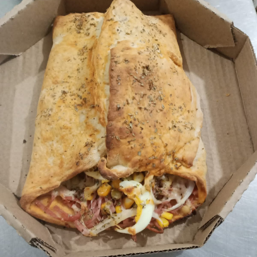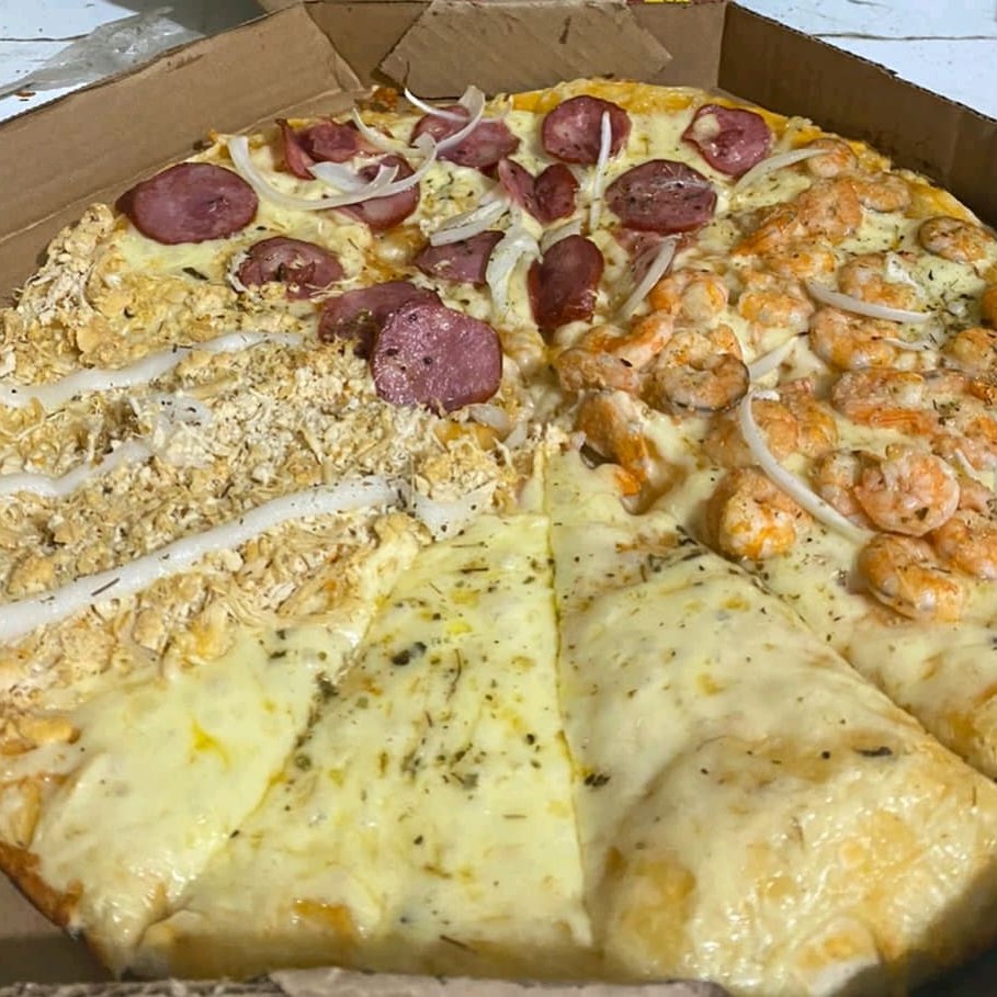 Massa da casa, metade calabresa (calabresa, cebola, queijo mussarela e orégano); metade mussarela (queijo mussarela e orégano); metade frango catupiry (frango desfiado, queijo mussarela, catupiry e orégano); metade camarão (camarão, alho, cebola, queijo mussarela e orégano).