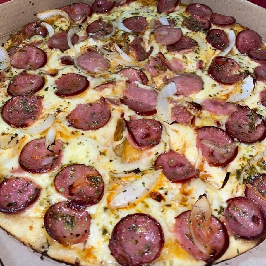 Pão pizza de calabresa (25 cm): Pão macio com massa feita da casa coberto com linguiça calabresa fatiada, cebola, queijo mussarela e orégano.