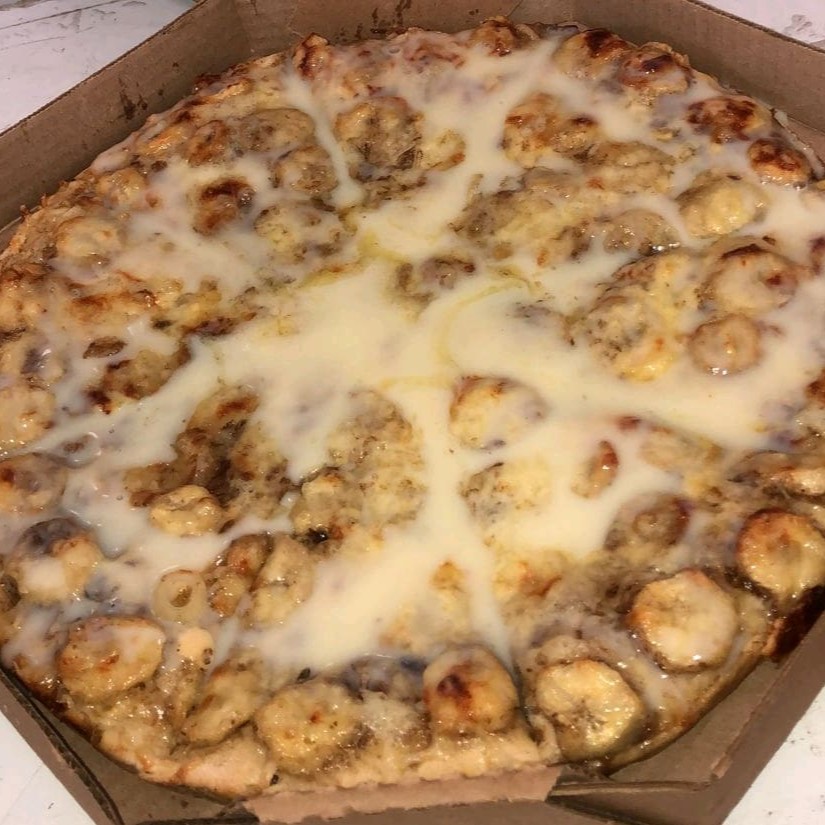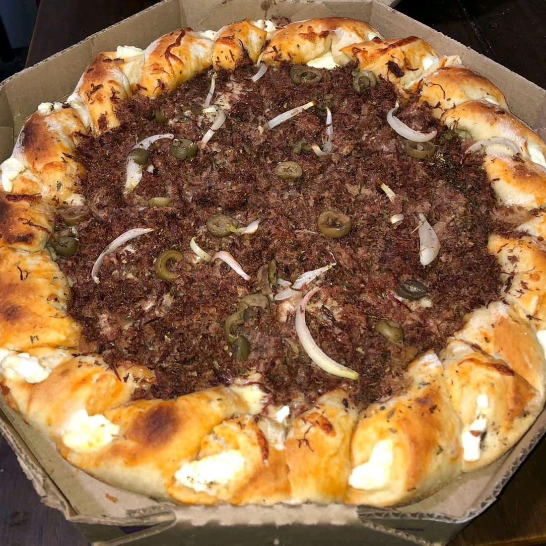 Massa da casa com charque (carne de charque desfiada, cebola, queijo mussarela, orégano), com borda recheada de cream cheese.