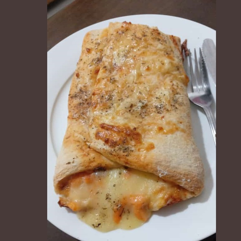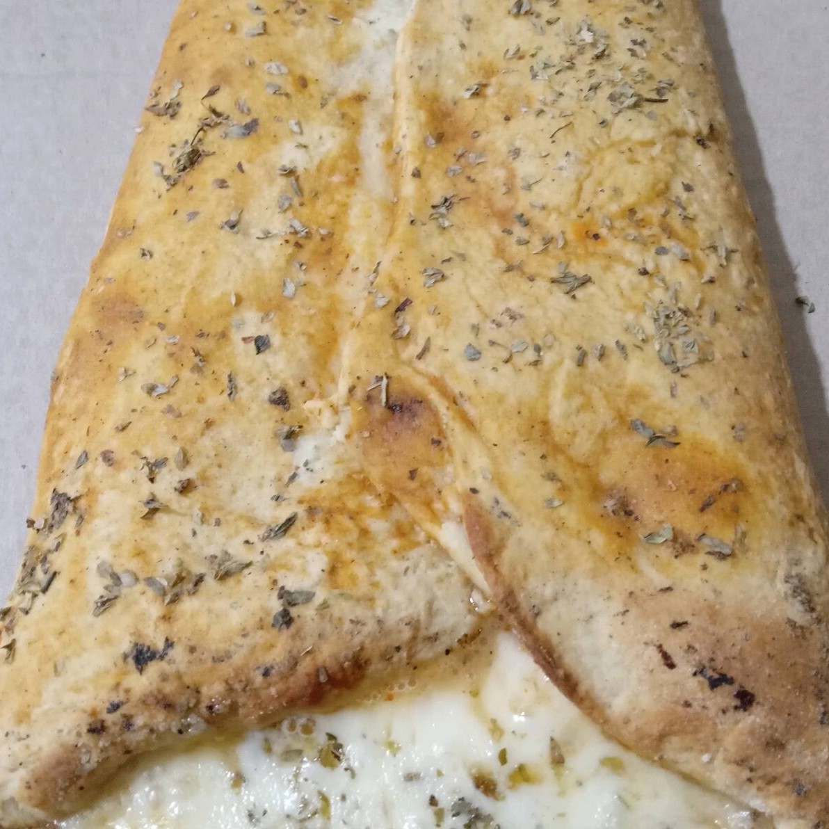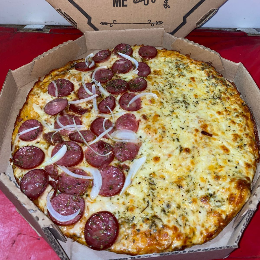 Massa da casa, (calabresa linguiça calabresa fatiada, cebola, queijo mussarela, orégano) e borda recheada de cheddar.