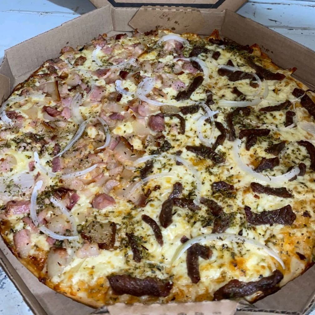 Massa da casa com meia bacon (bacon crocante, queijo mussarela, orégano) e meia carne de sol (carne de sol desfiada, cebola, queijo mussarela, orégano).