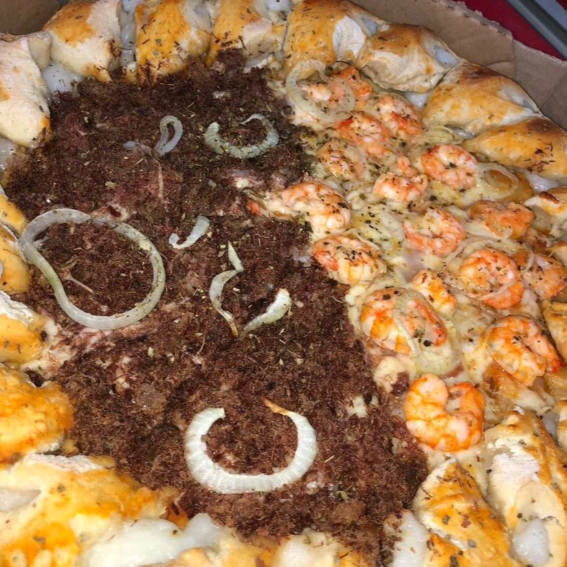 Massa da casa com metade de charque (carne de charque desfiada, cebola, queijo mussarela e orégano), metade de camarão (camarões temperados, cebola, queijo mussarela e orégano) e borda recheada de catupiry.