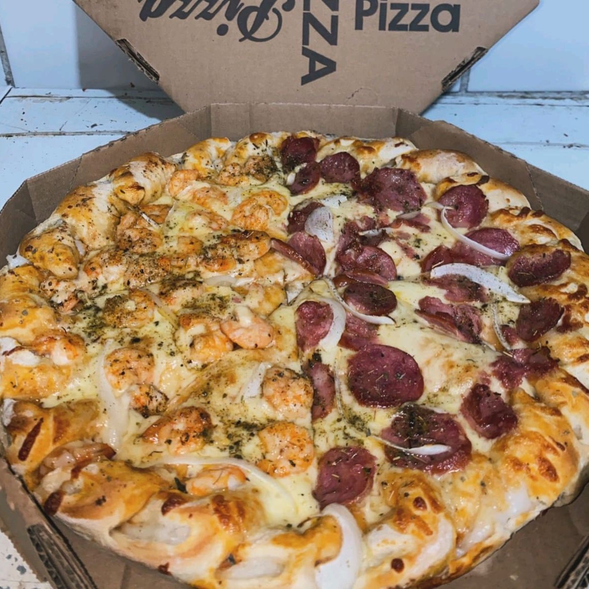 Massa da casa com meia camarão (camarões temperados, queijo mussarela, cebola e orégano) e meia calabresa (linguiça calabresa fatiada, cebola, queijo mussarela e orégano), com borda recheada de catupiry.