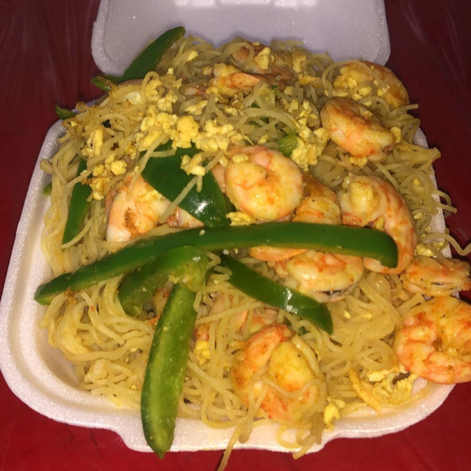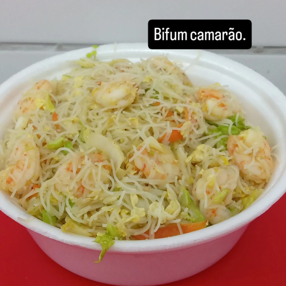Bifum Camarão da Casa: porção para duas pessoas, preparada com macarrão de arroz (bifum), camarões selecionados, cenoura, repolho, brócolis, couve-flor e molho shoyu especial da casa.