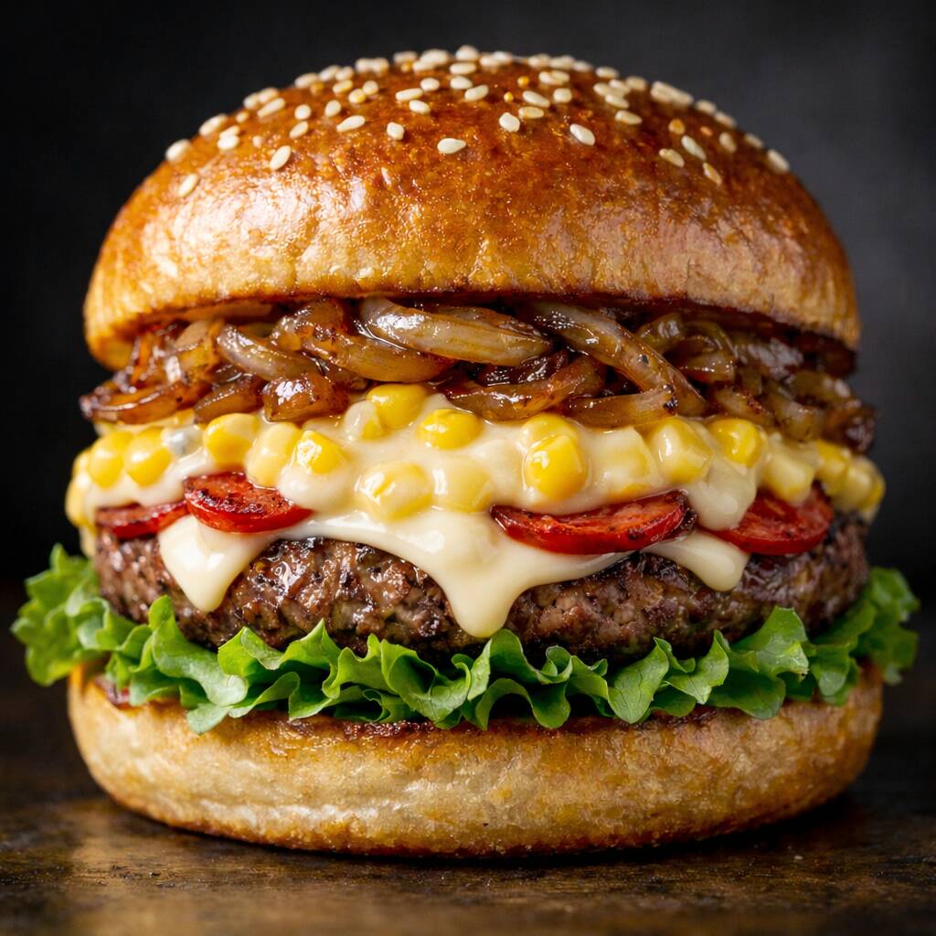 PÃO BOLA DE GERGELIM, 90 GRAMAS DE CARNE ARTESANAL QUEIJO MUSSARELA, SALADA, CALABRESA, CREME DE MILHO E CEBOLA CARAMELIZADA.