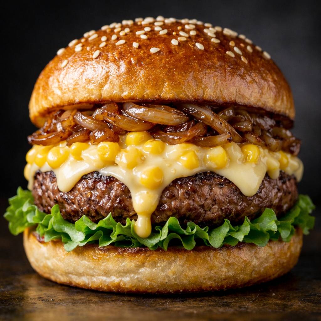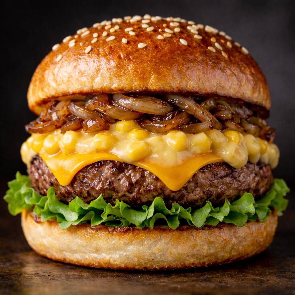 PÃO BOLA DE GERGELIM, 90 GRAMAS DE CARNE ARTESANAL, QUEIJO CHEDDAR, SALADA, CREME DE MILHO E CEBOLA CARAMELIZADA