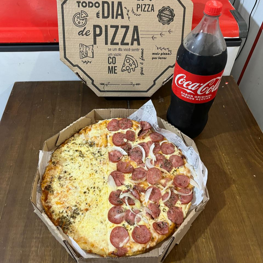 Pizza grande meio a meio: Calabresa fatiada e mussarela derretida sobre molho de tomate e massa crocante. Acompanha: Coca-Cola 2L gelada.